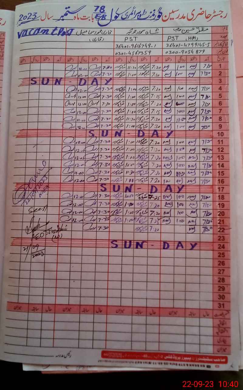 | Name: MU**** HU**** Designation: (School Headmaster's/Headmistress's) PST Phone/Cell Number: 03**** |