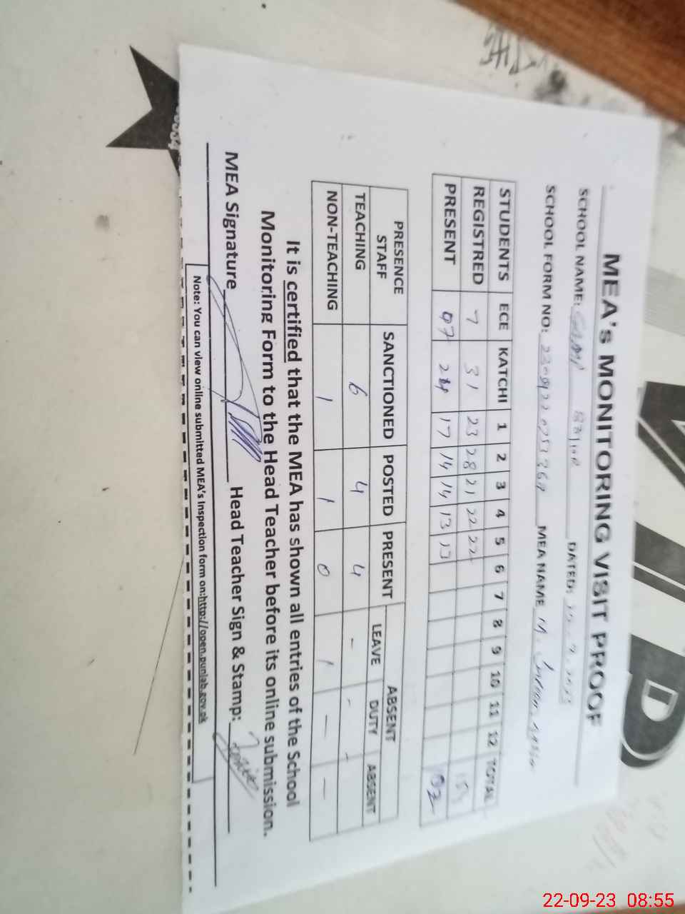 | Attendance Register | Head Teacher | MEA with School | Visit Proof |