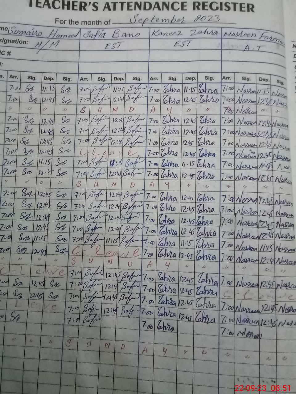 | CNIC | Full Name | Designation | R/C | Absence During Last Calender Month |