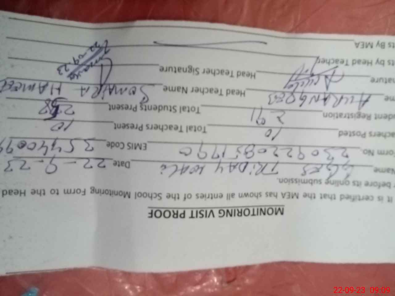 | Attendance Register | Head Teacher | MEA with School | Visit Proof |