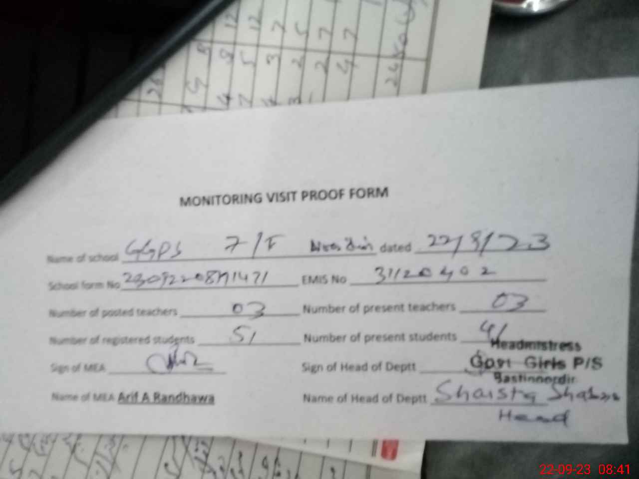 | Name: SH**** SH**** Designation: (School Headmaster's/Headmistress's) ESE SCIENCE MATH Phone/Cell Number: 03**** |