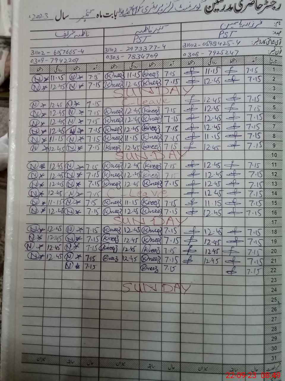 | CNIC | Full Name | Designation | R/C | Absence During Last Calender Month |