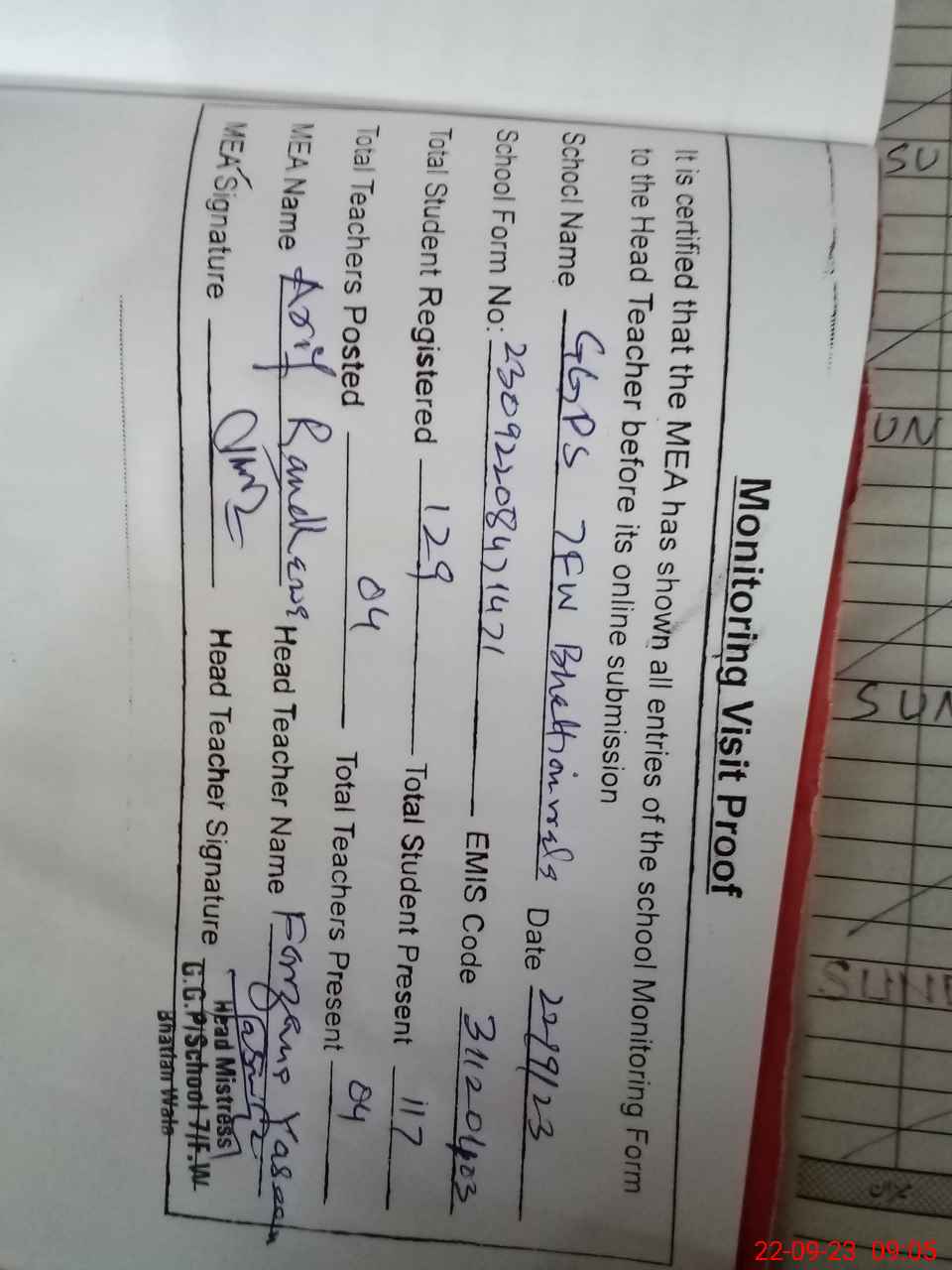 | Attendance Register | Head Teacher | MEA with School | Visit Proof |
