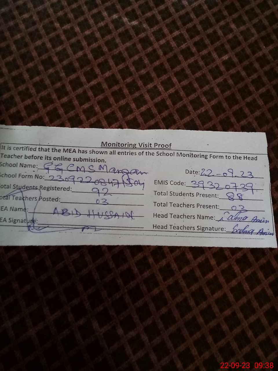 | Attendance Register | Head Teacher | MEA with School | Visit Proof |