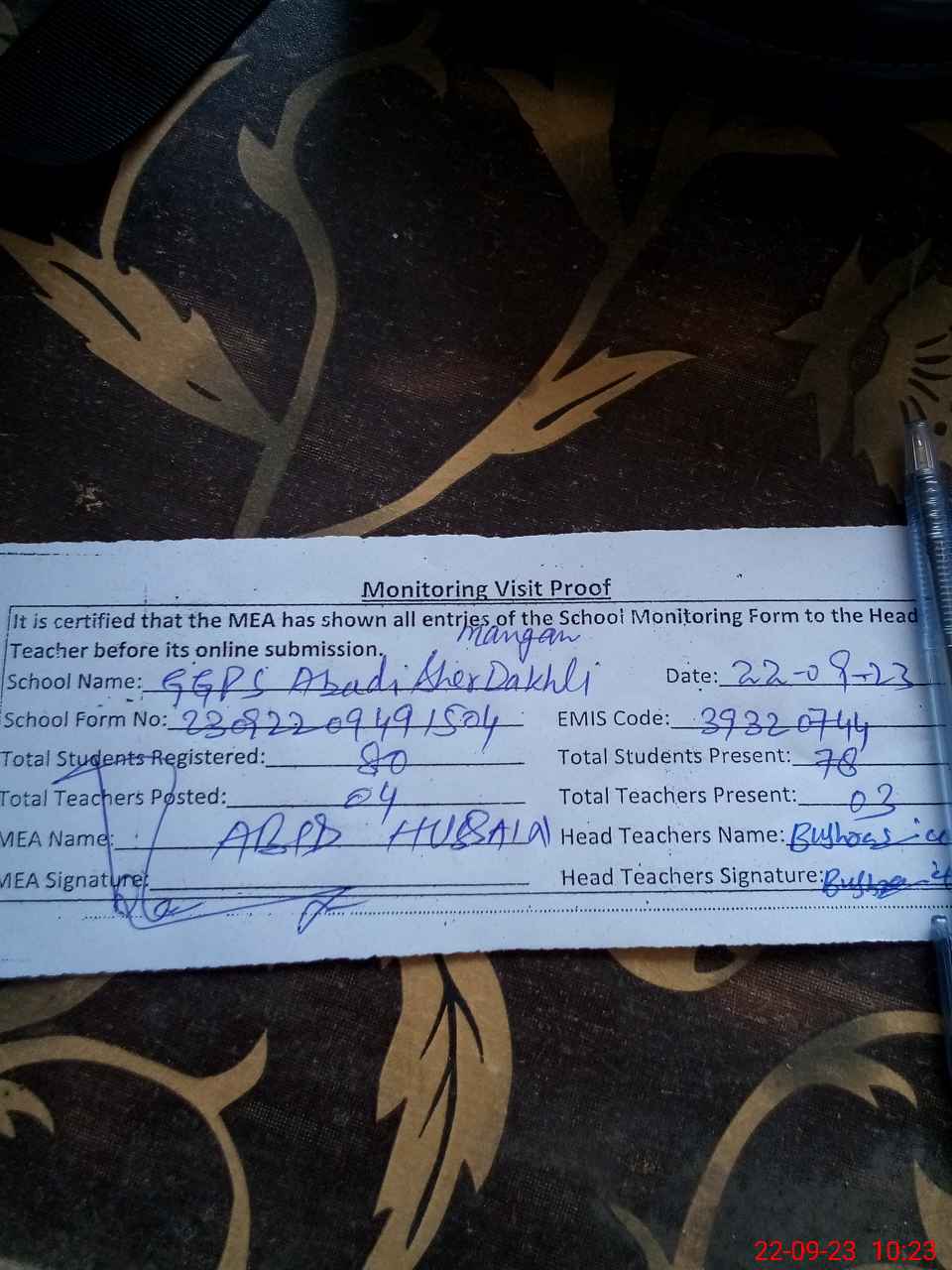 | Attendance Register | Head Teacher | MEA with School | Visit Proof |
