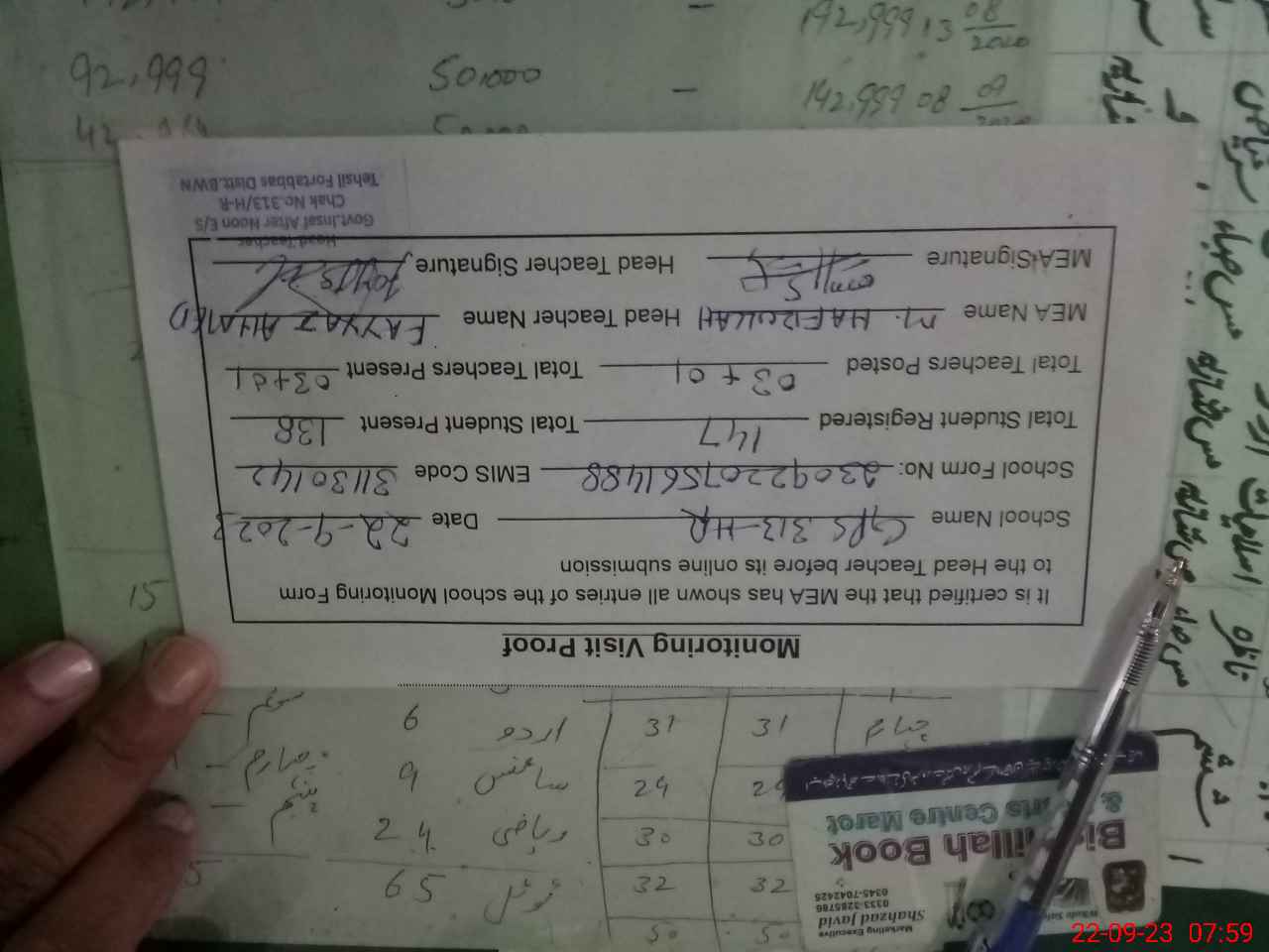 | Attendance Register | Head Teacher | MEA with School | Visit Proof |