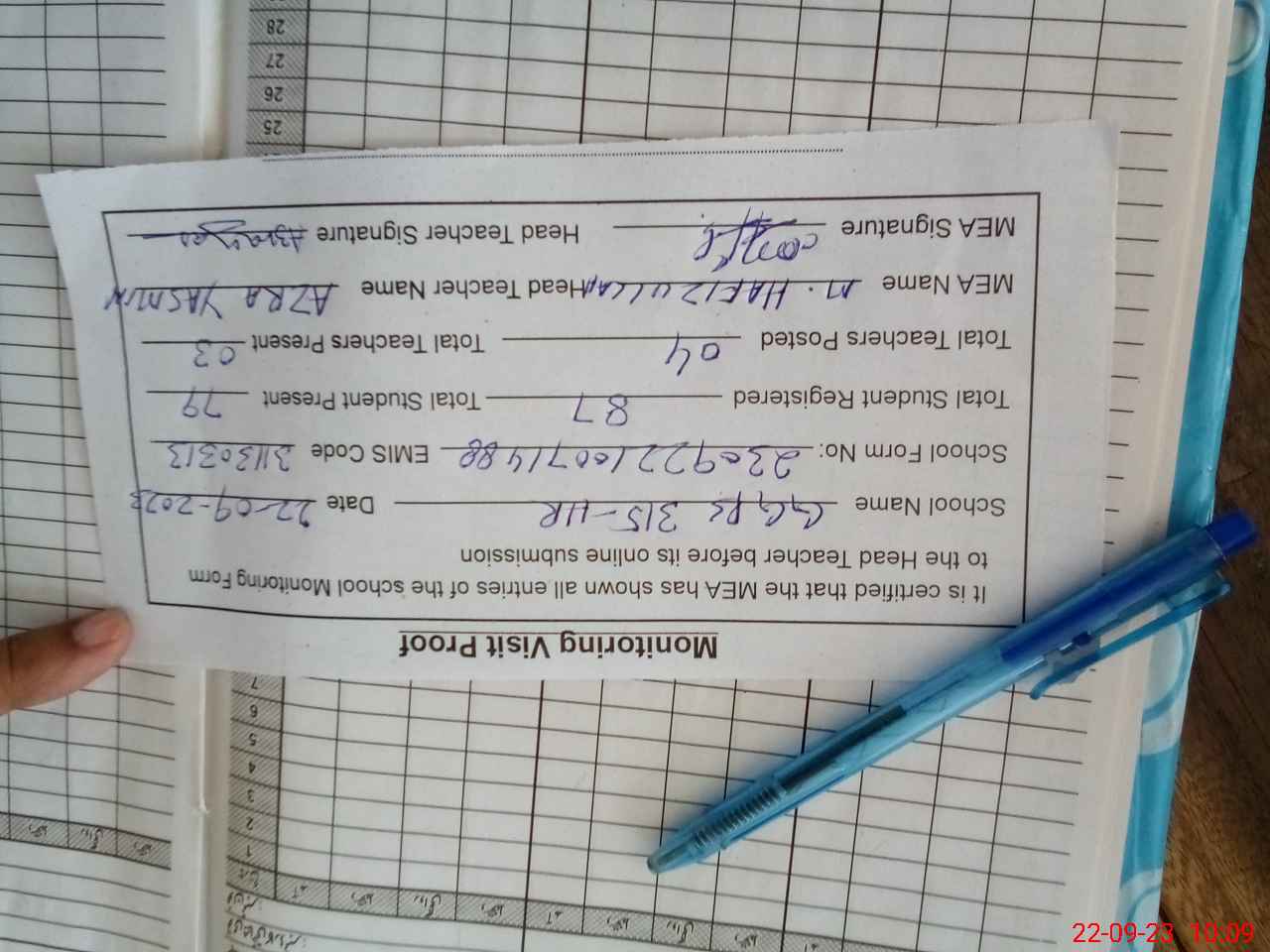 | Attendance Register | Head Teacher | MEA with School | Visit Proof |