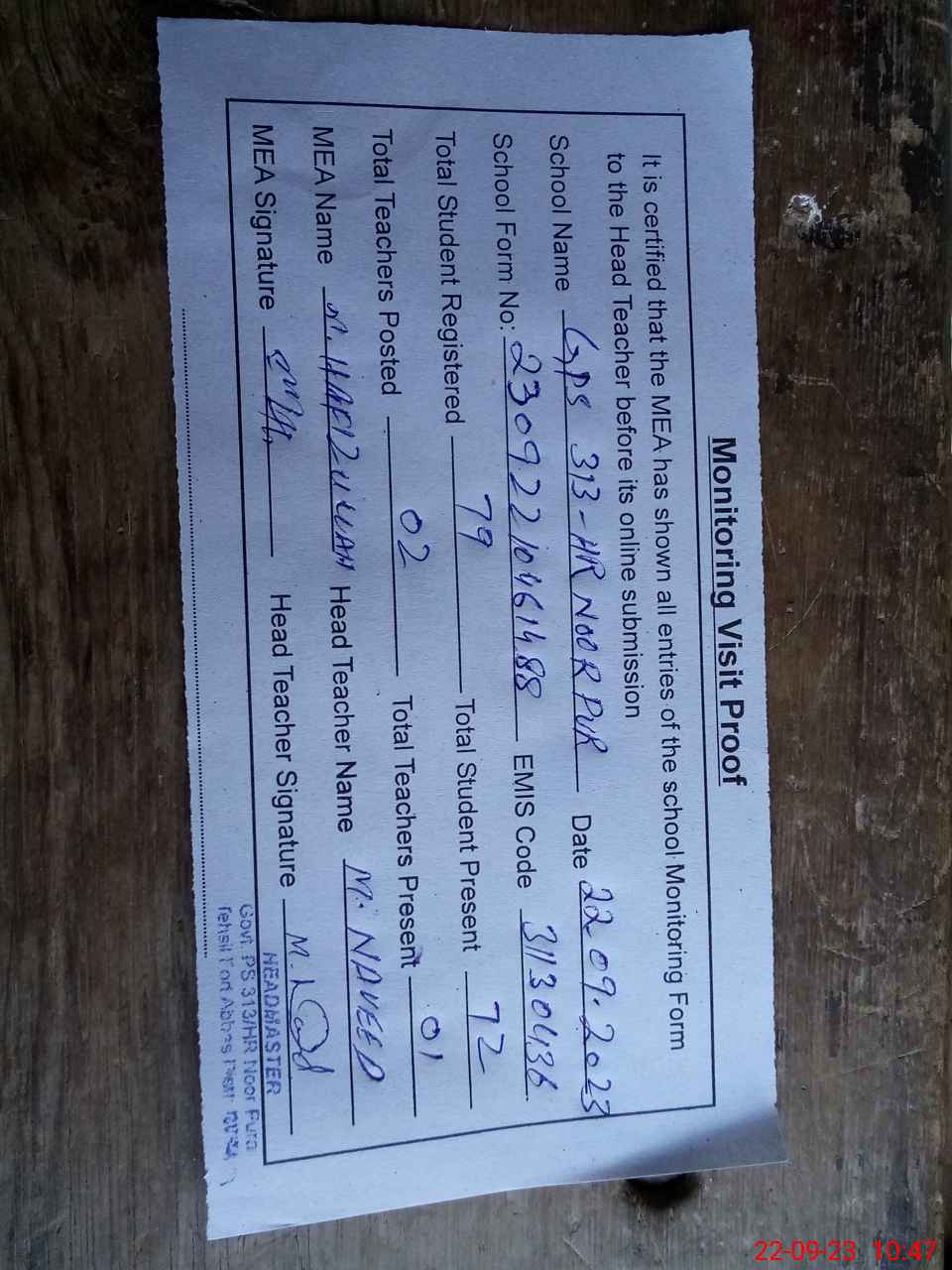 | EMIS Code: 31130436 | Name of School: GPS CHAK NO 313 HR NOOR PUR | |||