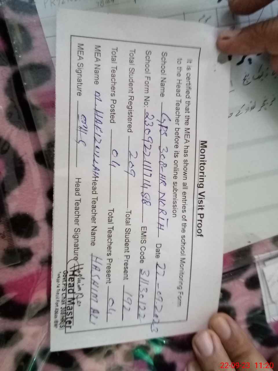 | Attendance Register | Head Teacher | MEA with School | Visit Proof |