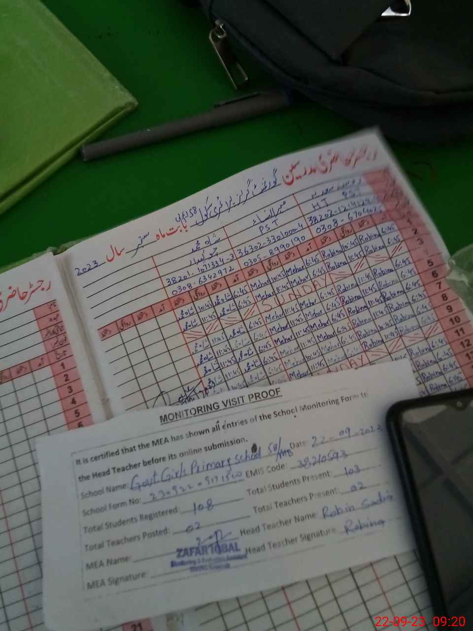 | Attendance Register | Head Teacher | MEA with School | Visit Proof |