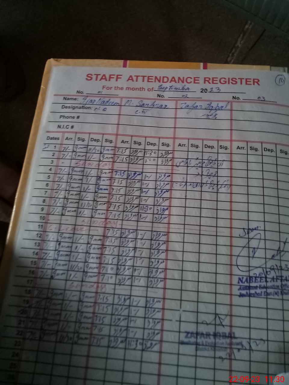 | CNIC | Full Name | Designation | R/C | Absence during last cal. month |