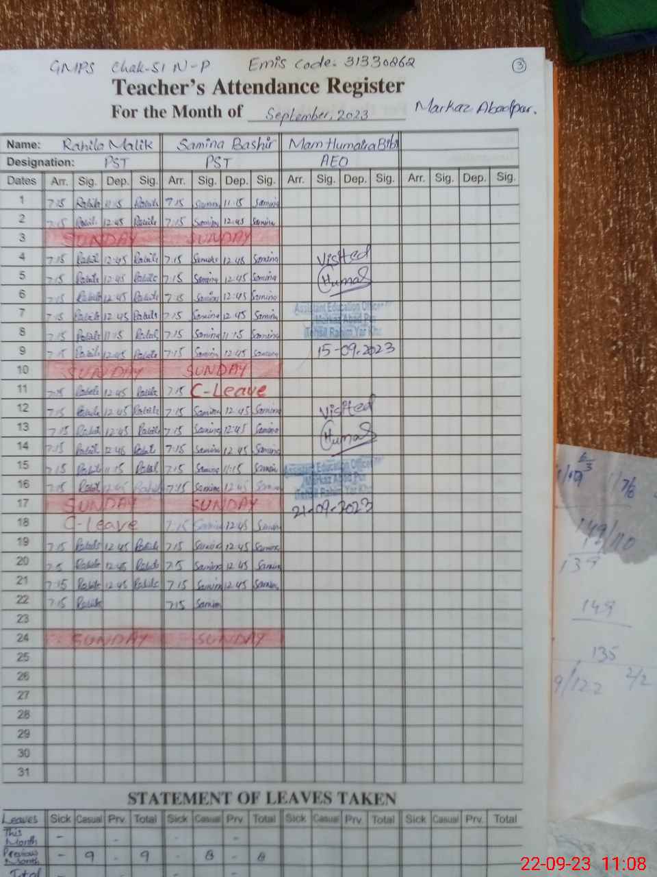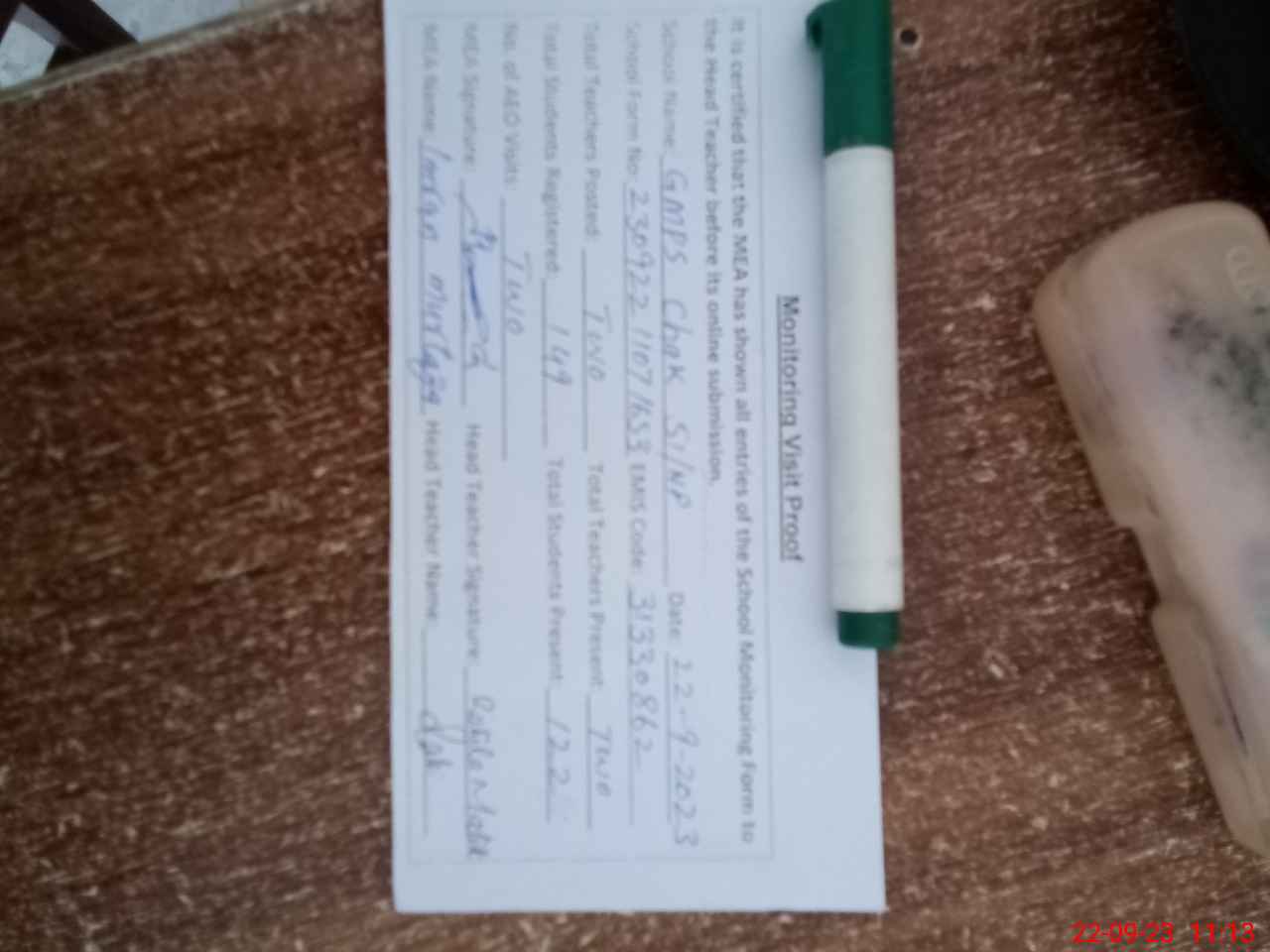 | Attendance Register | Head Teacher | MEA with School | Visit Proof |