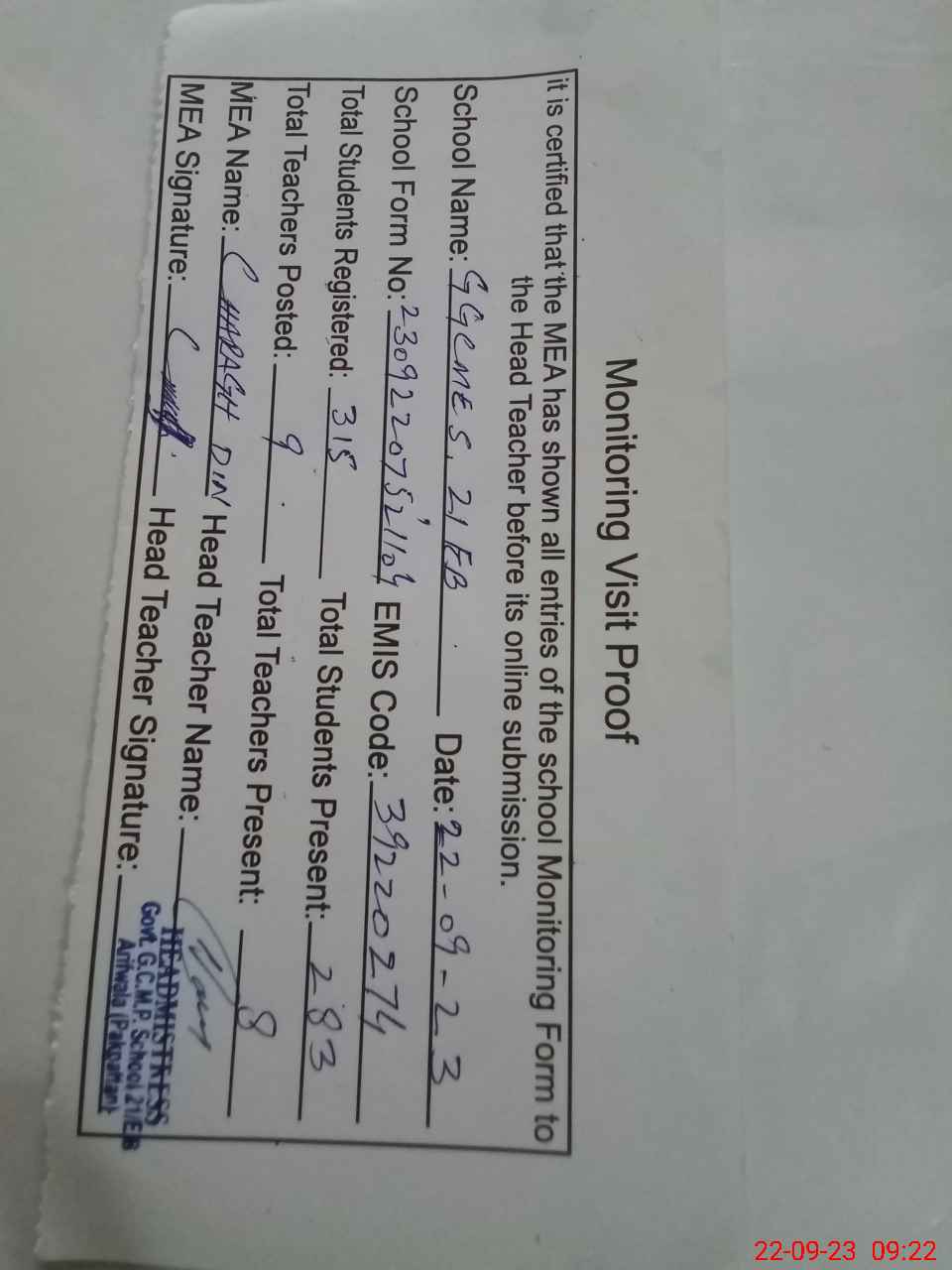| Attendance Register | Head Teacher | MEA with School | Visit Proof |