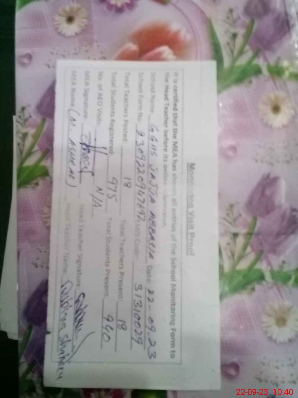 | Attendance Register | Head Teacher | MEA with School | Visit Proof |
