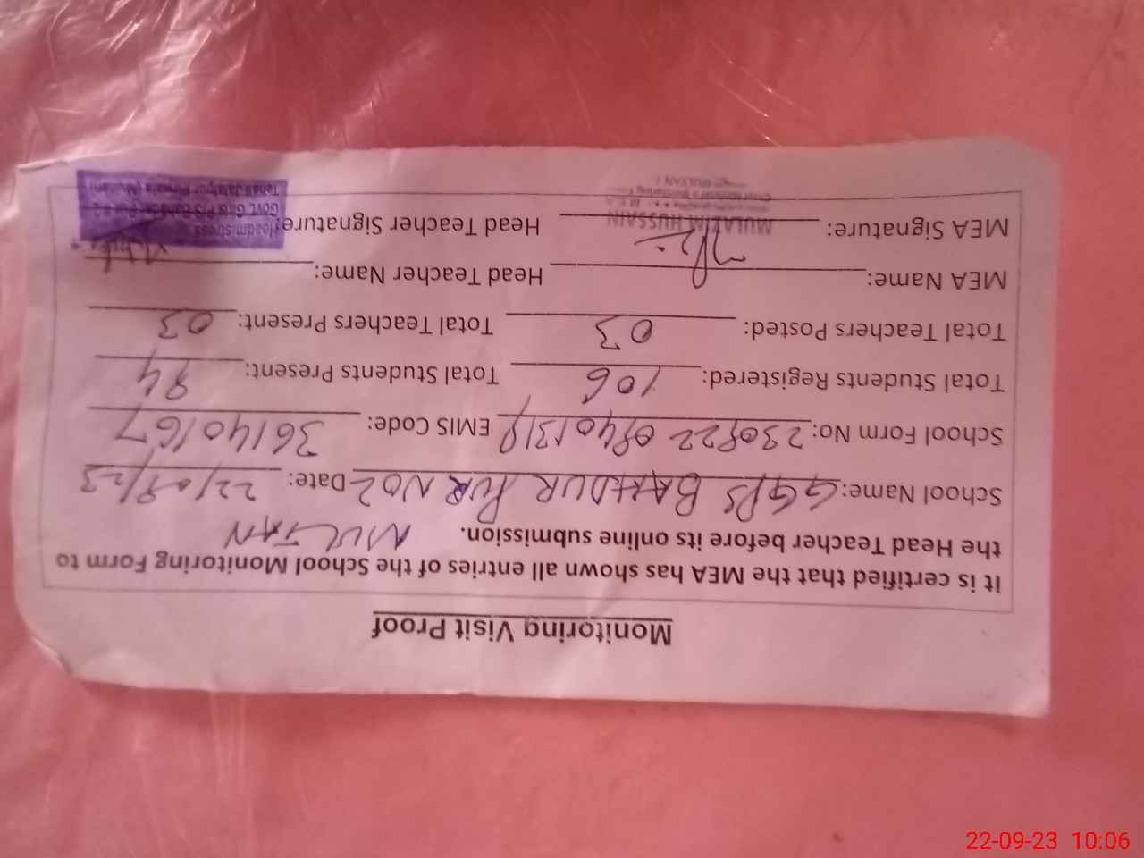 | Certified that this School was Inspected by the Undersigned MEA/DMO Today and the Information Stated Above is as Per Record. | |||||