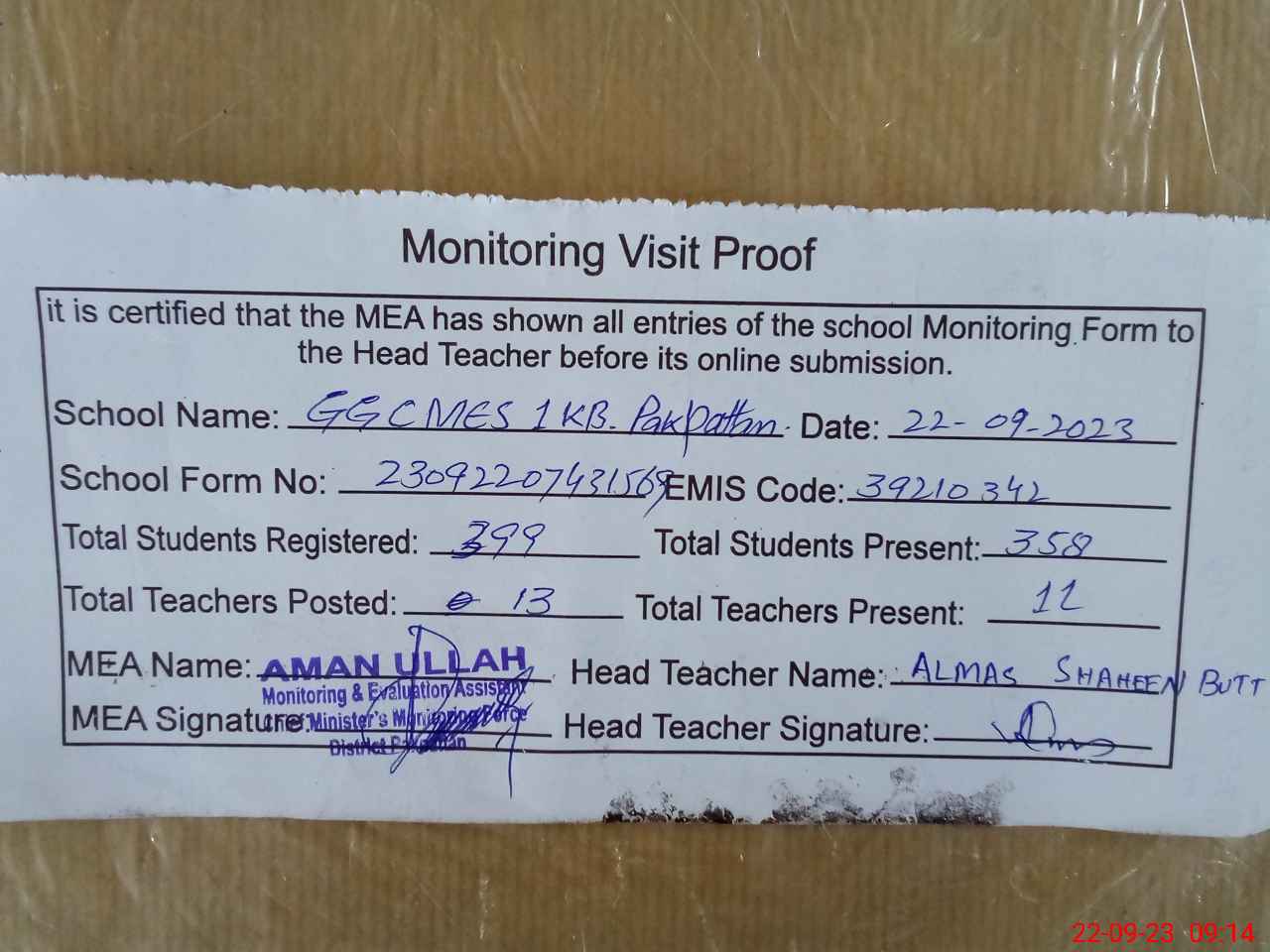| Attendance Register | Head Teacher | MEA with School | Visit Proof |