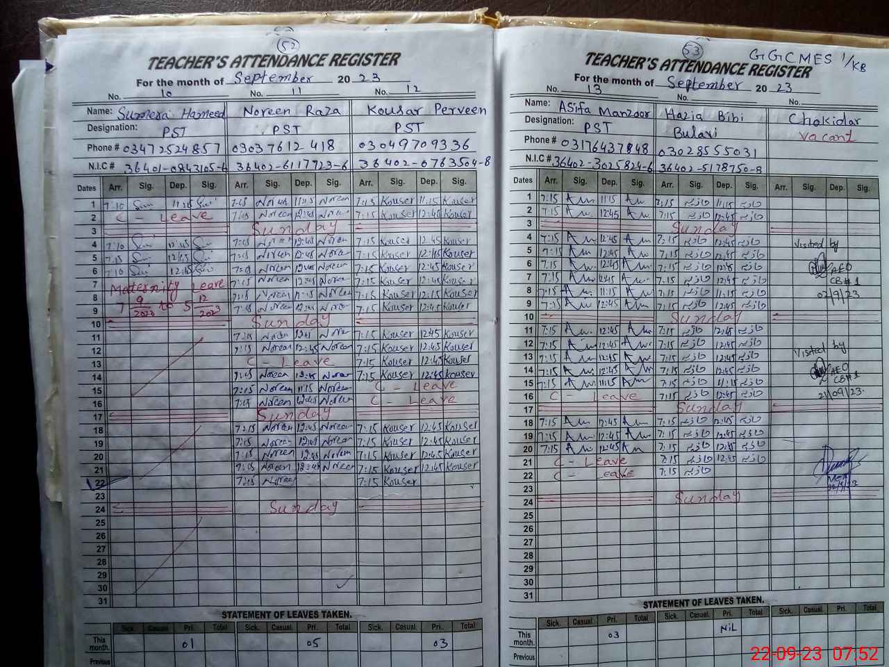 | CNIC | Full Name | Designation | R/C | Absence During Last Calender Month |
