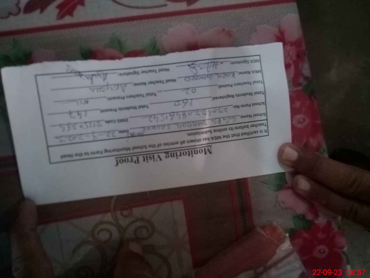 | Attendance Register | Head Teacher | MEA with School | Visit Proof |
