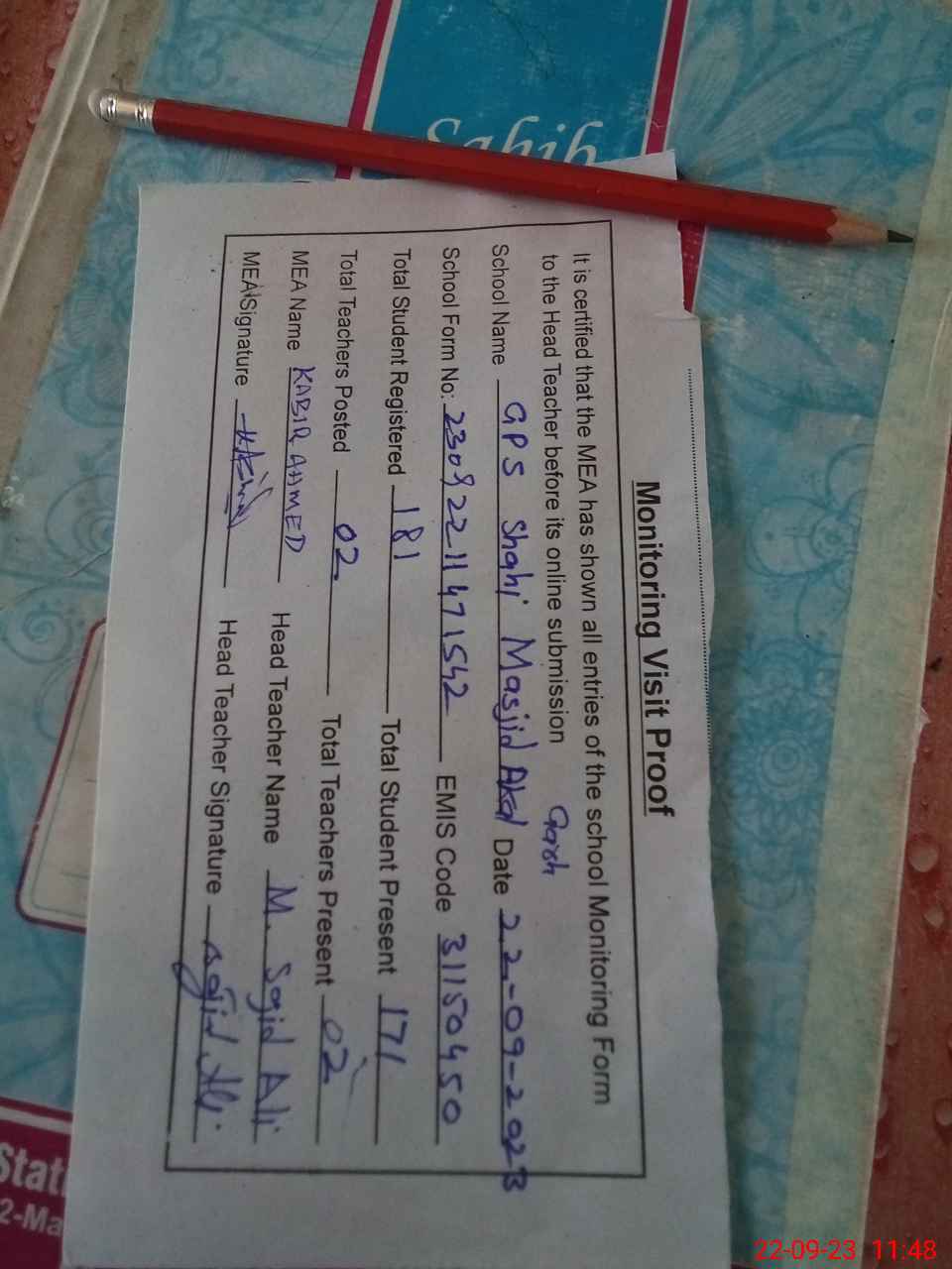 | Attendance Register | Head Teacher | MEA with School | Visit Proof |