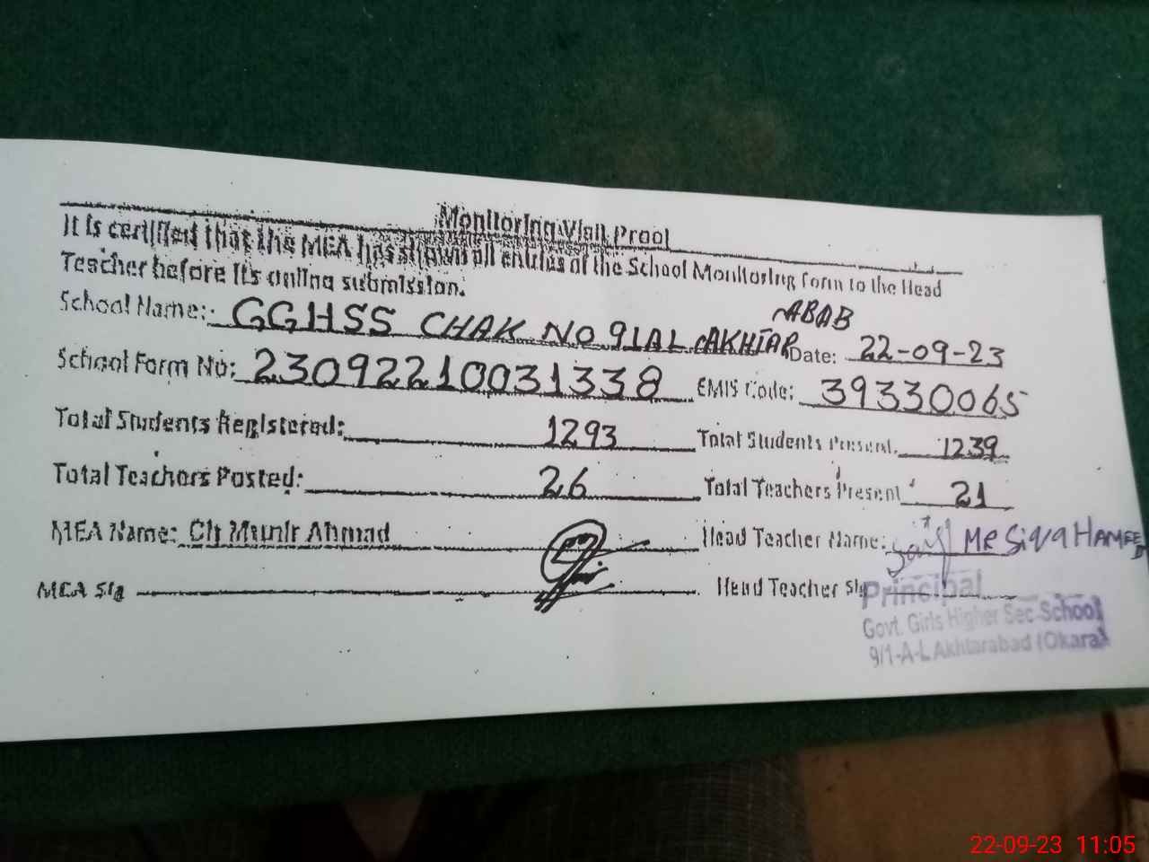 | EMIS Code: 39330065 | Name of School: GGHSS 9/1-AL AKHTAR ABAD | |||