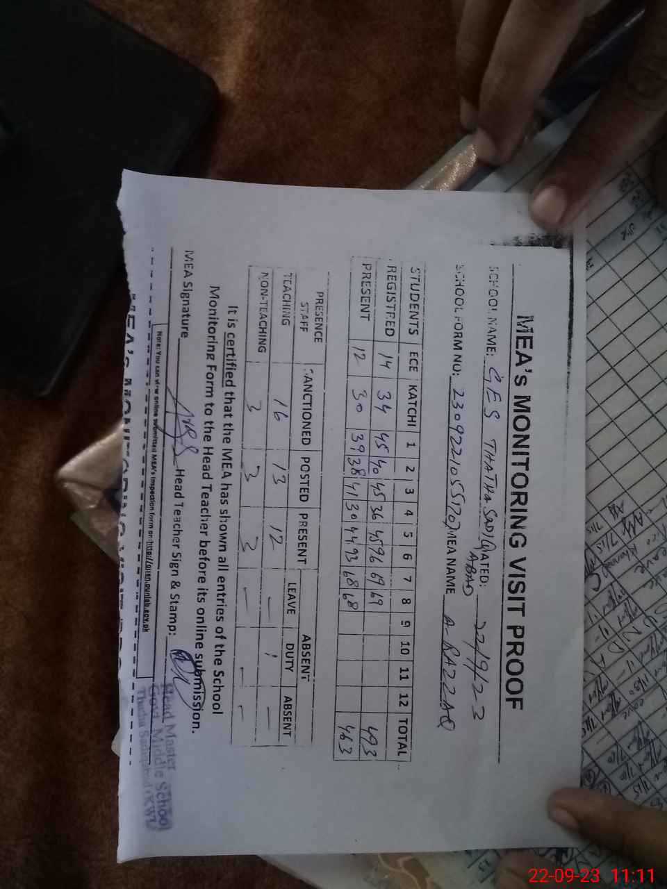 | Attendance Register | Head Teacher | MEA with School | Visit Proof |