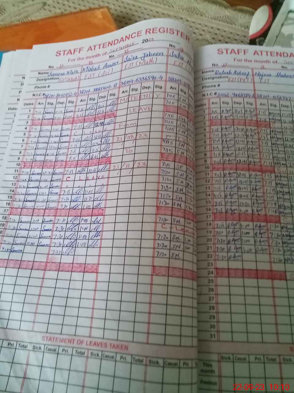 | CNIC | Full Name | Designation | R/C | Absence During Last Calender Month |