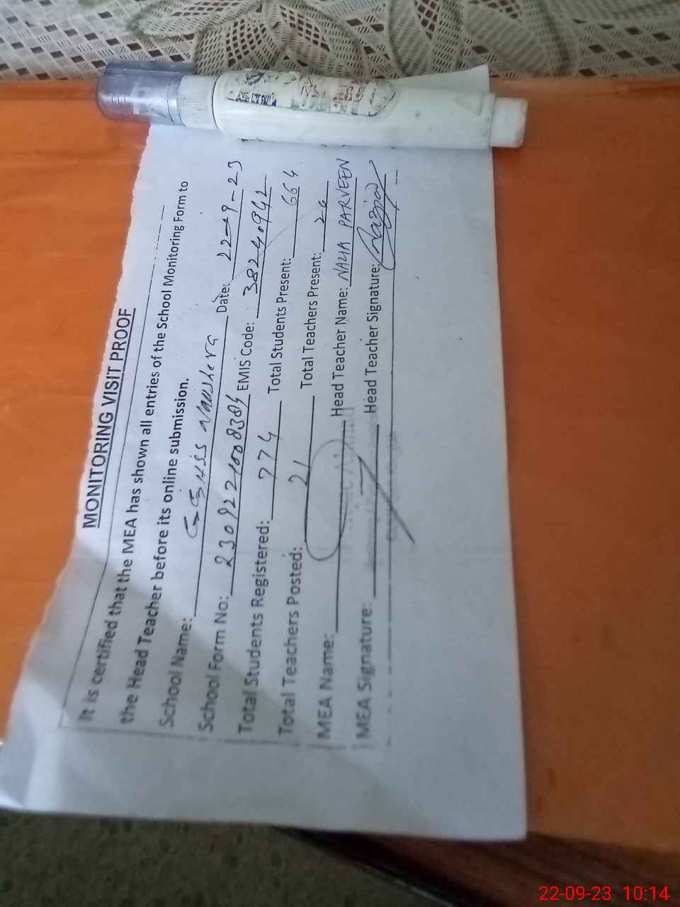 | Attendance Register | Head Teacher | MEA with School | Visit Proof |