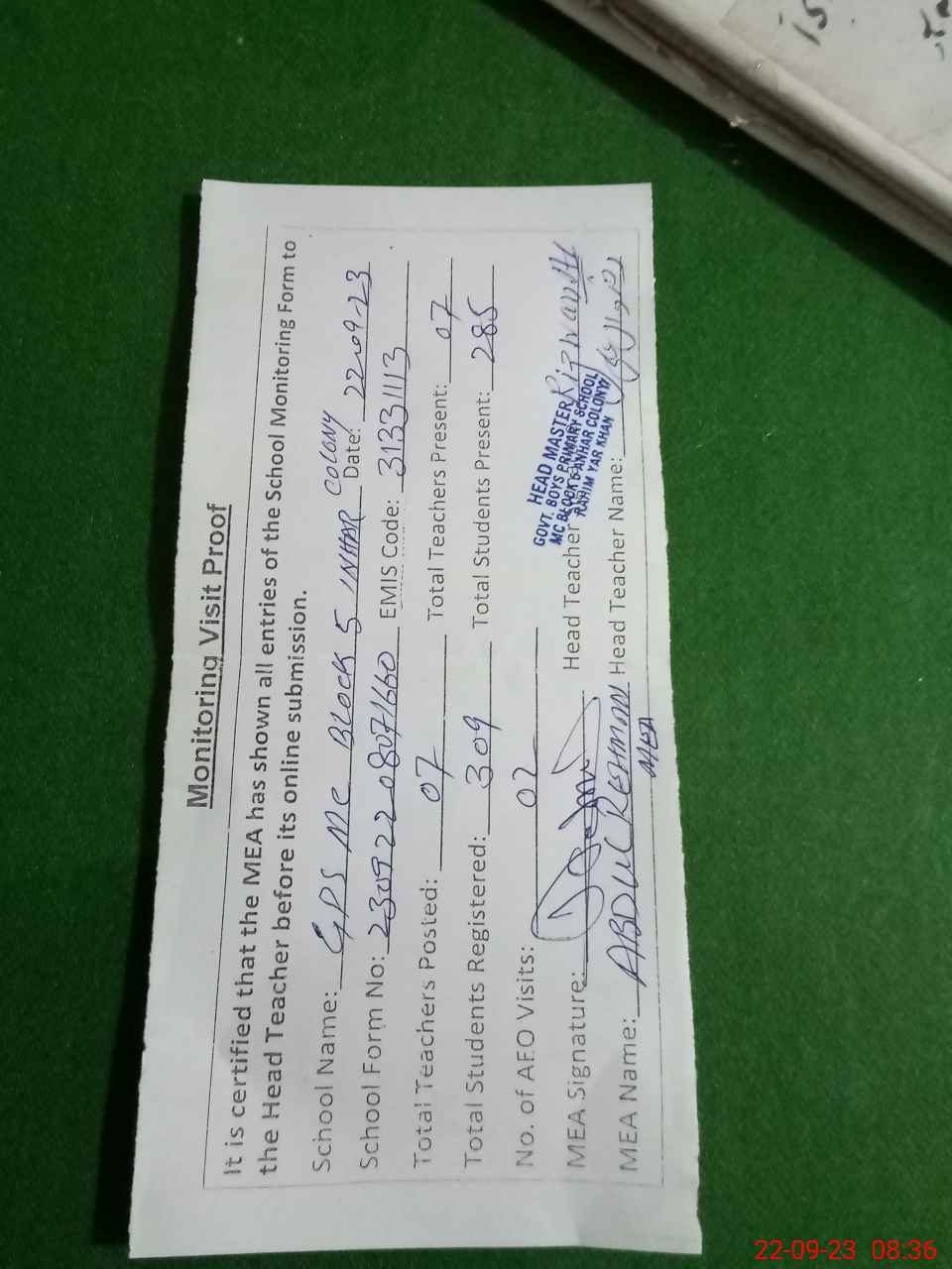| EMIS Code: 31331113 | Name of School: GPS MC BLOCK NO. 5 INHAR COLONY | |||