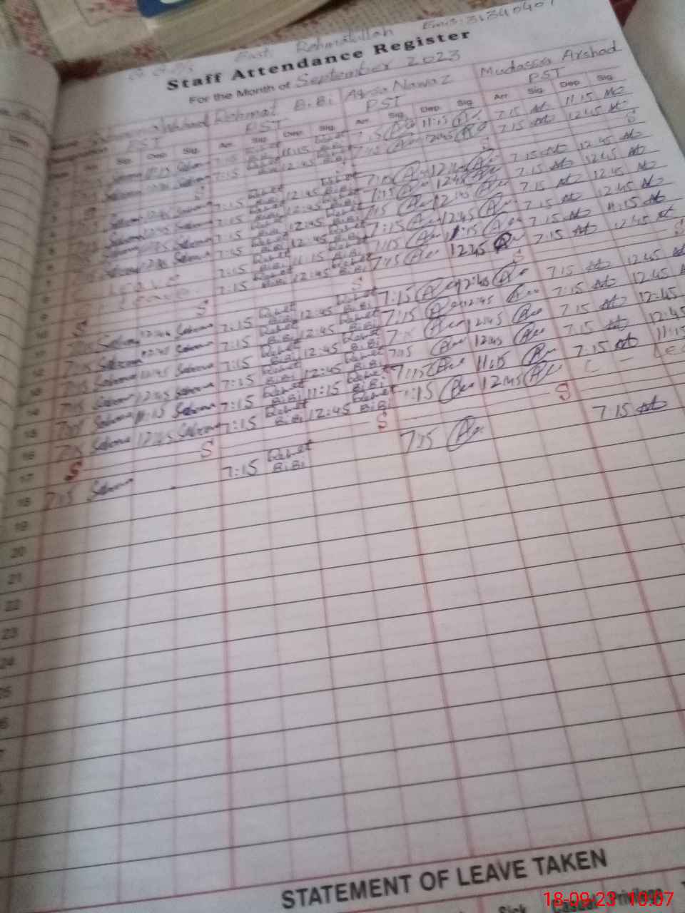 | Leave | Duty | Absent | Maternity | Medical | Ex- Pak |