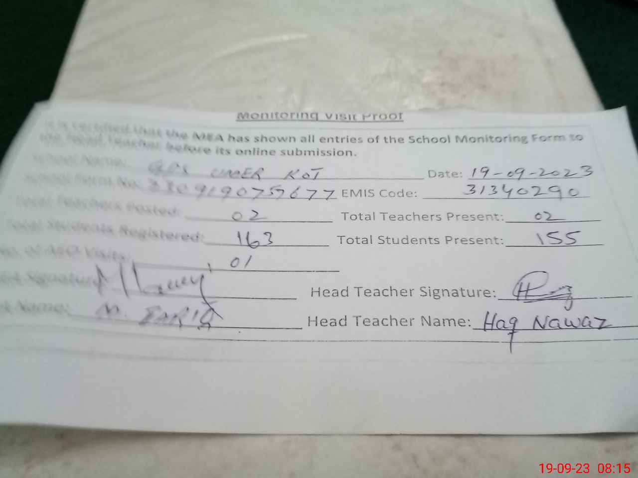 | Attendance Register | Head Teacher | MEA with School | Visit Proof |