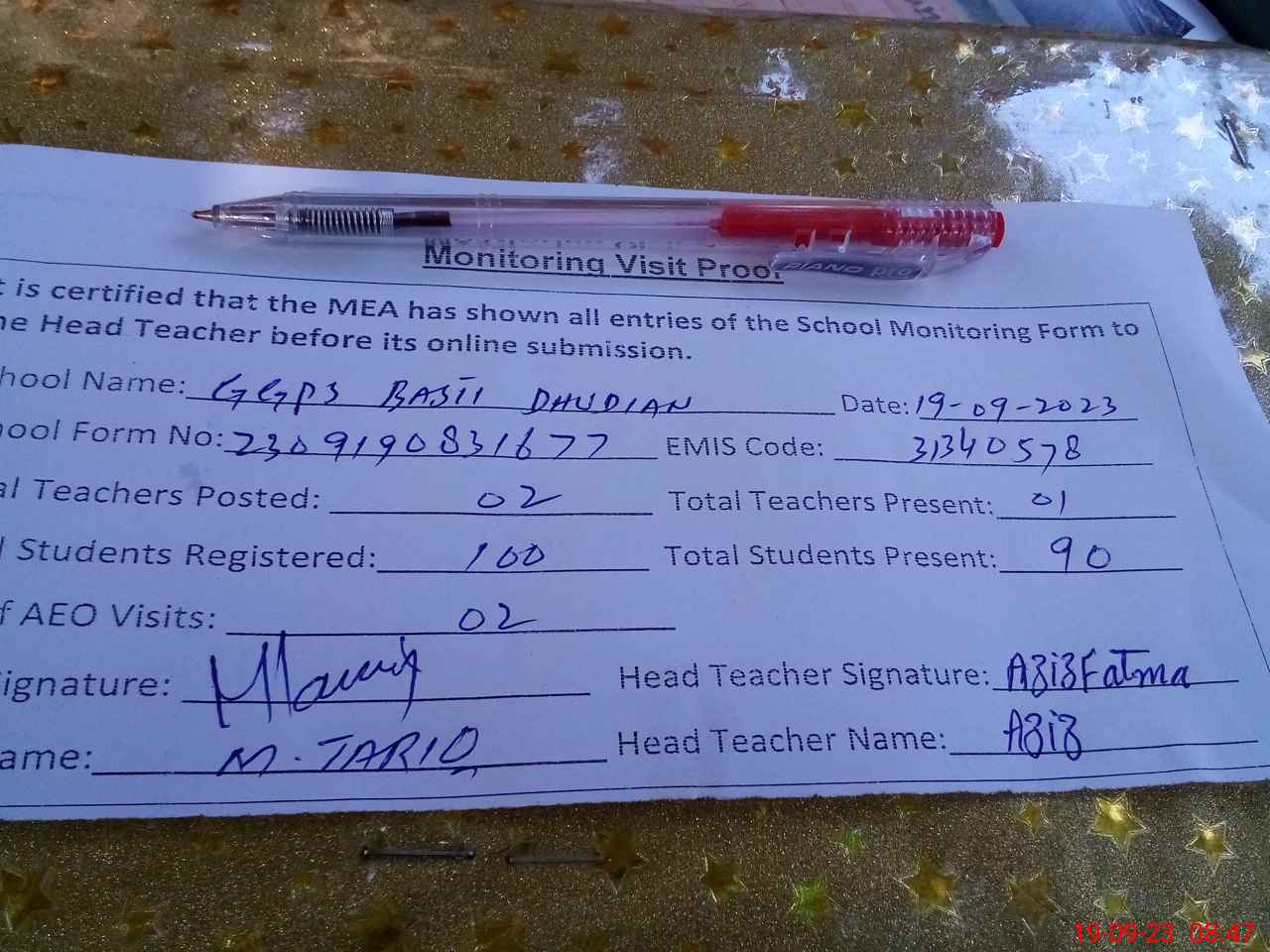 | Attendance Register | Head Teacher | MEA with School | Visit Proof |