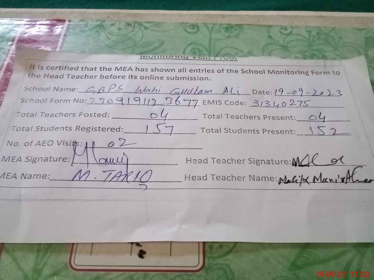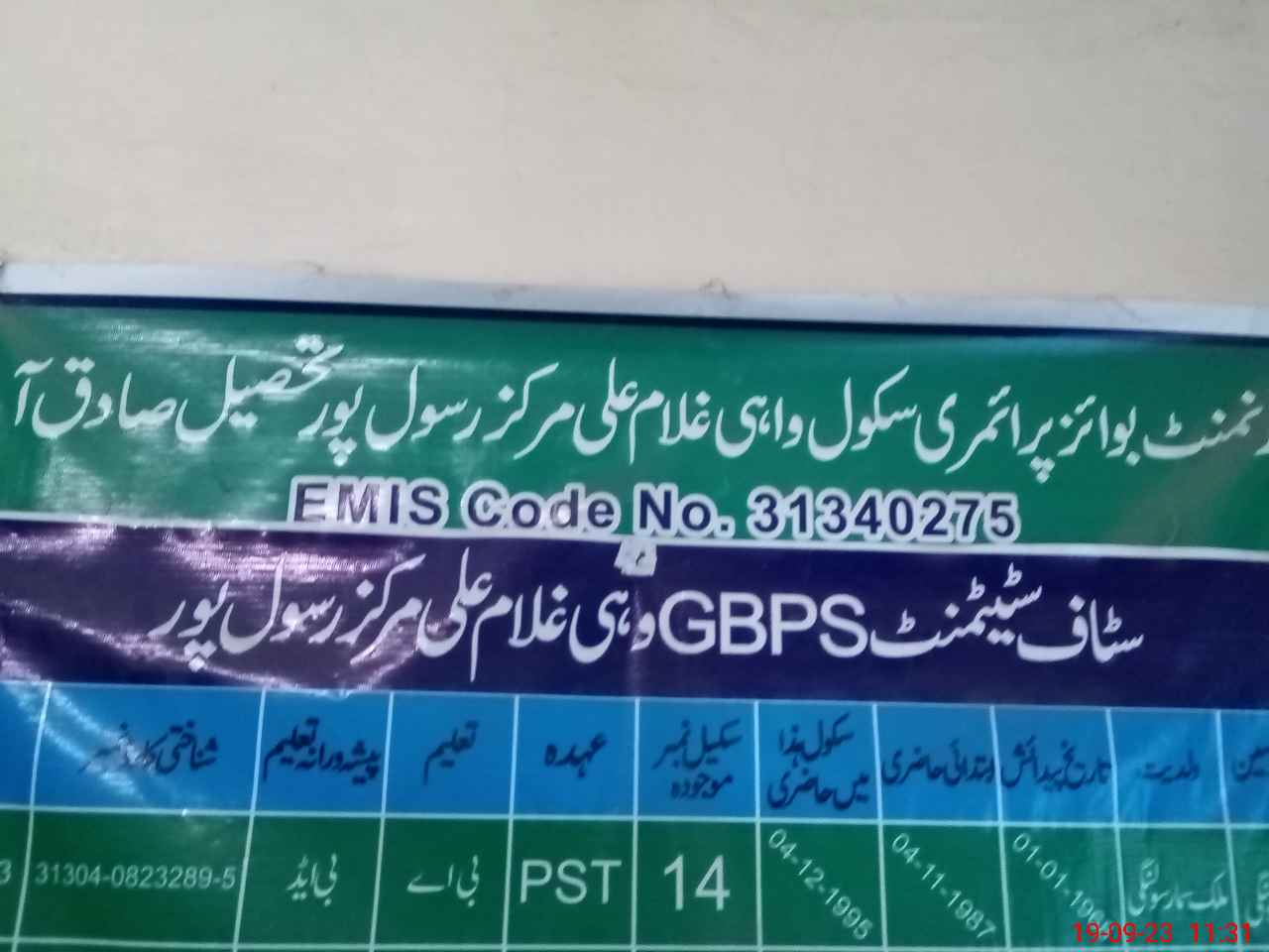 | EMIS Code: 31340275 | Name of School: GPS WAHI GHULAM ALI | |||
