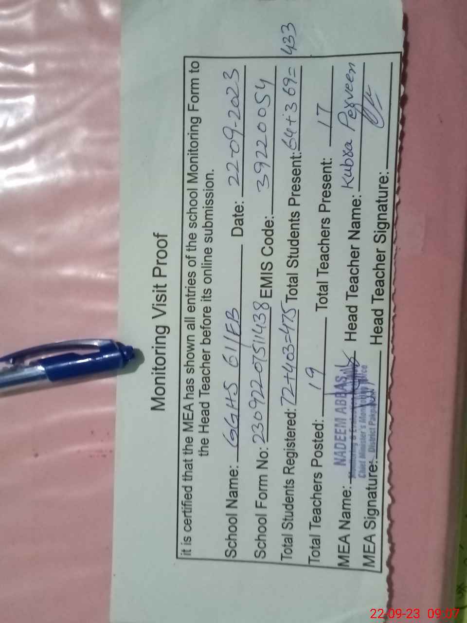 | Certified that this School was Inspected by the Undersigned MEA/DMO Today and the Information Stated Above is as Per Record. | |||||