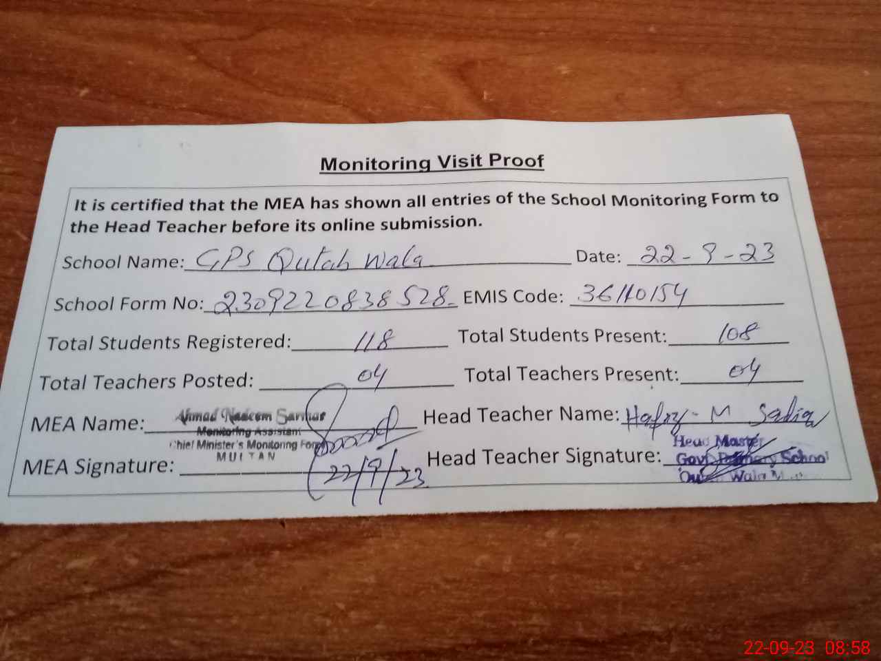 | EMIS Code: 36110154 | Name of School: GPS QUTTUB WALA ISMAIL ABAD P/O MULTAN | |||