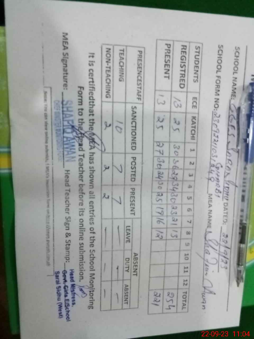 | Attendance Register | Head Teacher | MEA with School | Visit Proof |