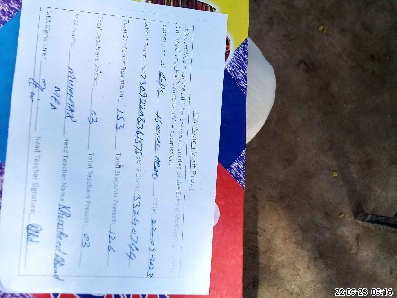 | Attendance Register | Head Teacher | MEA with School | Visit Proof |