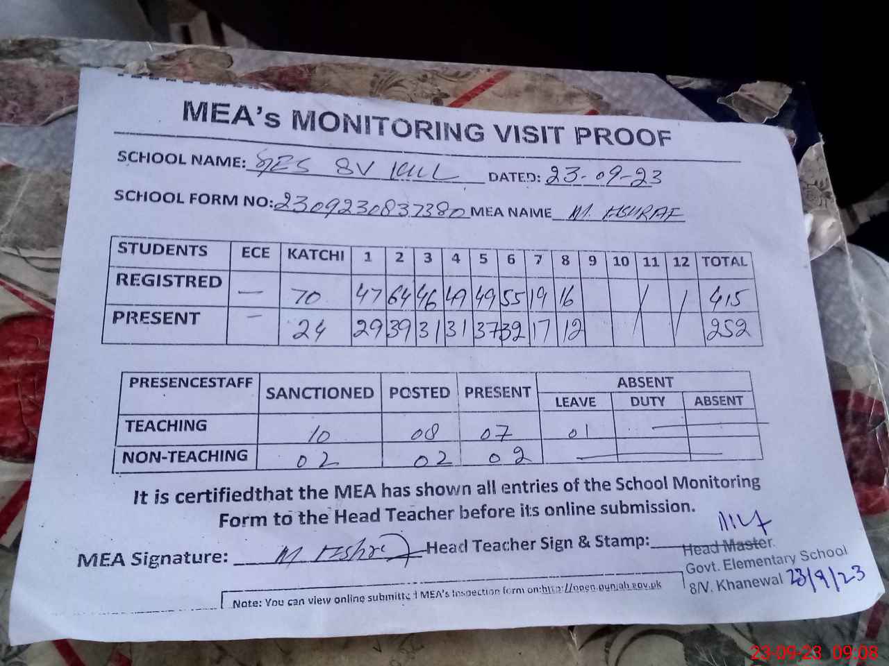 | Attendance Register | Head Teacher | MEA with School | Visit Proof |