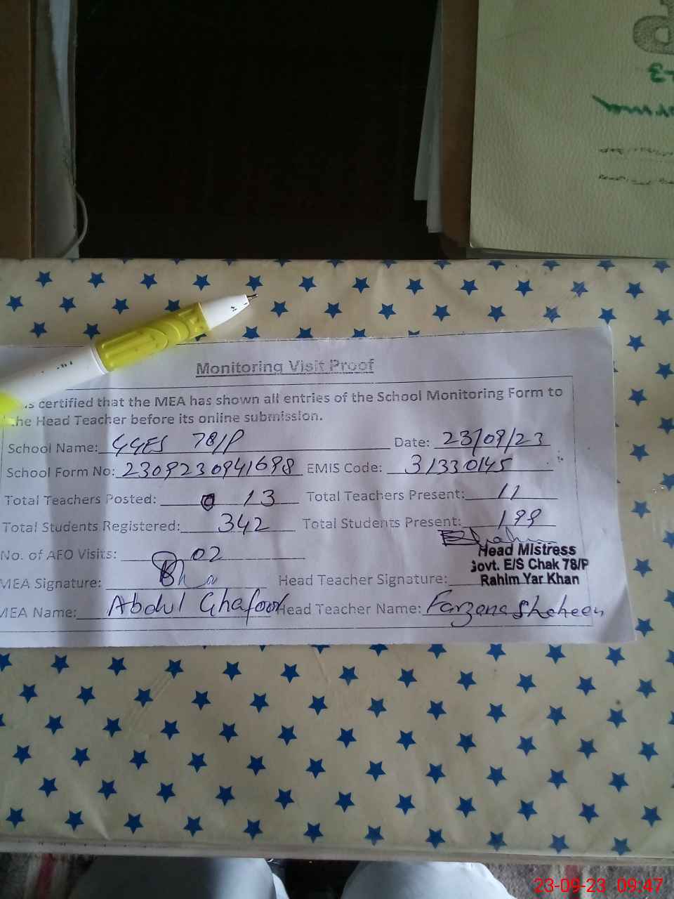 | Attendance Register | Head Teacher | MEA with School | Visit Proof |