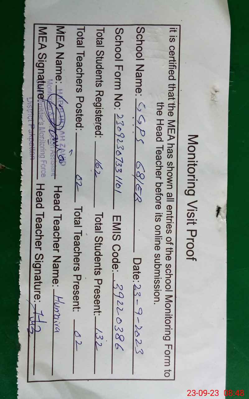 | Attendance Register | Head Teacher | MEA with School | Visit Proof |