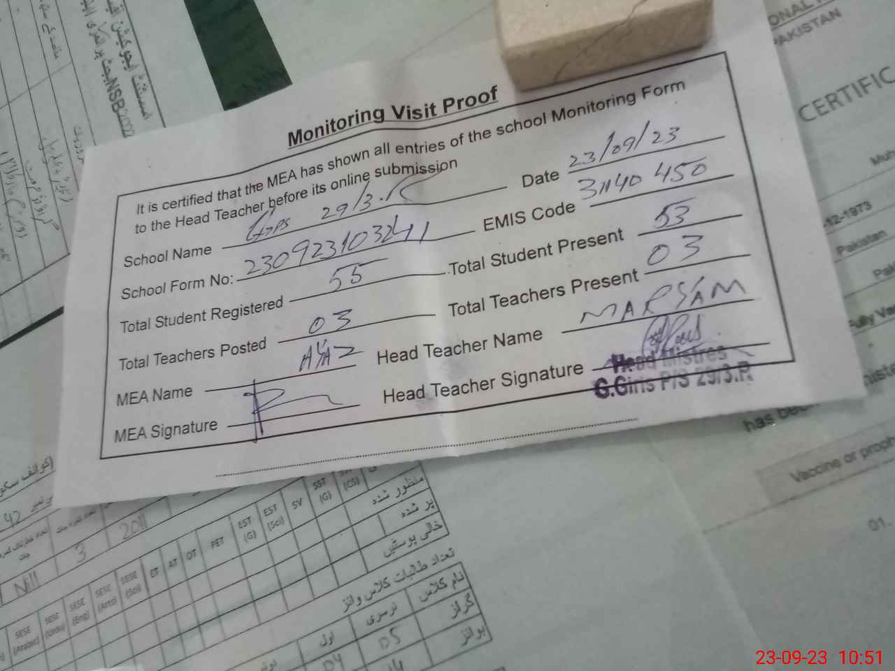 | Attendance Register | Head Teacher | MEA with School | Visit Proof |