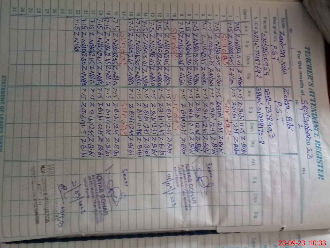 | Name: ZA**** UNNI**** Designation: (School Headmaster's/Headmistress's) PST Phone/Cell Number: 03**** |