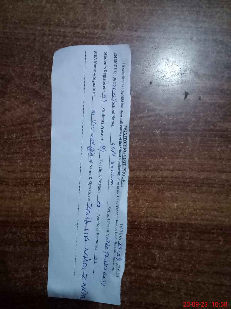 | Attendance Register | Head Teacher | MEA with School | Visit Proof |