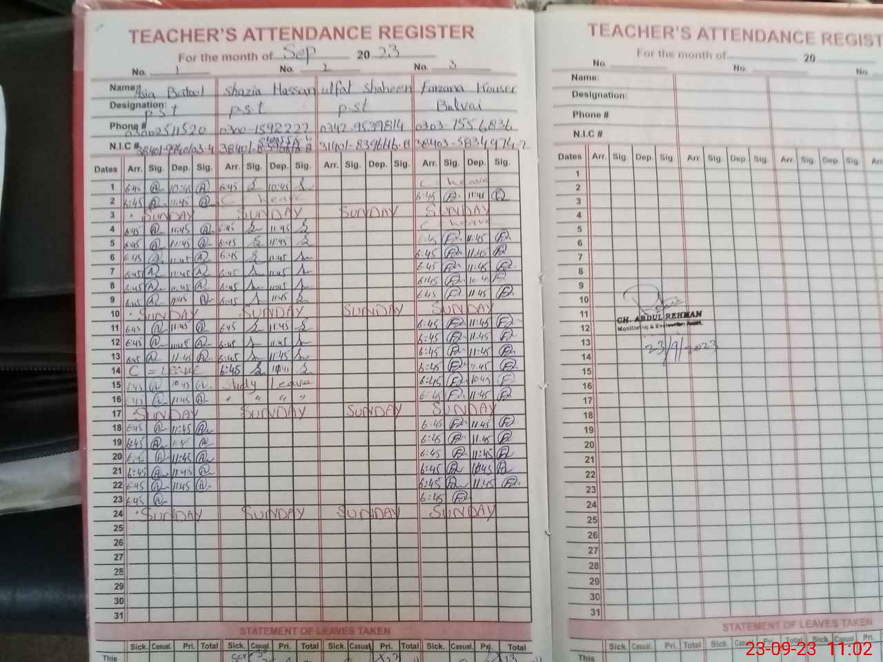 | CNIC | Full Name | Designation | R/C | Absence During Last Calender Month |
