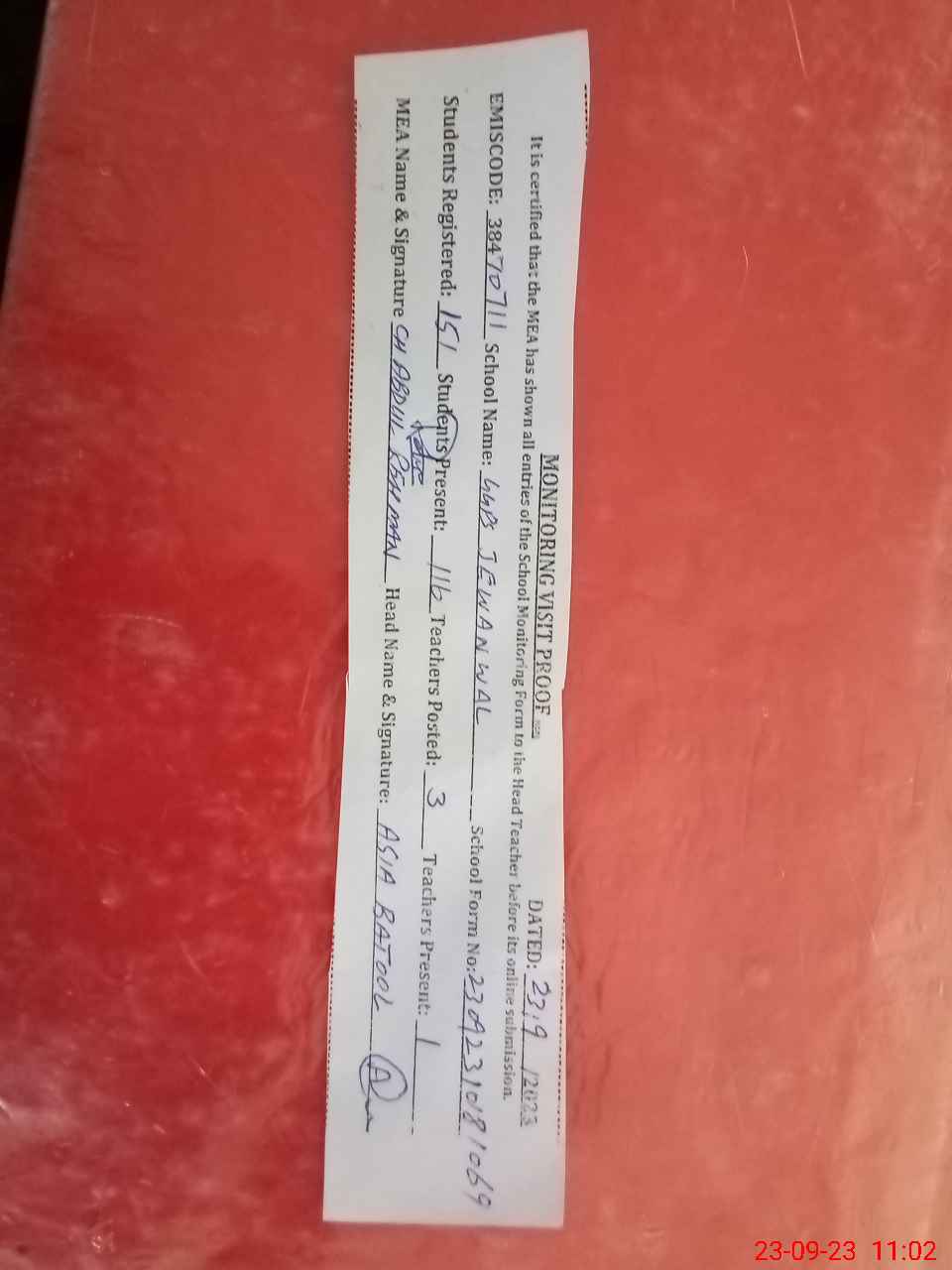 | Attendance Register | Head Teacher | MEA with School | Visit Proof |
