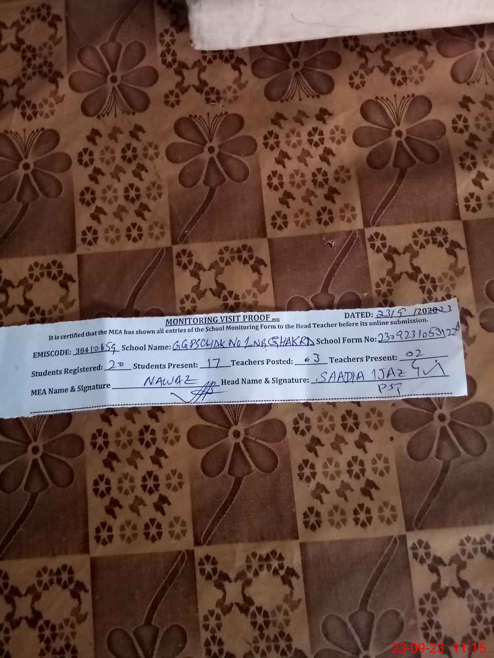 | Attendance Register | Head Teacher | MEA with School | Visit Proof |