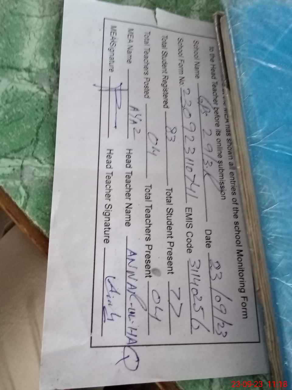 | Attendance Register | Head Teacher | MEA with School | Visit Proof |