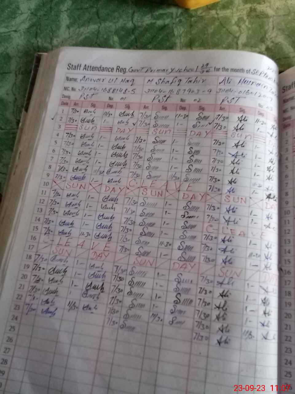 | CNIC | Full Name | Designation | R/C | Absence during last cal. month |