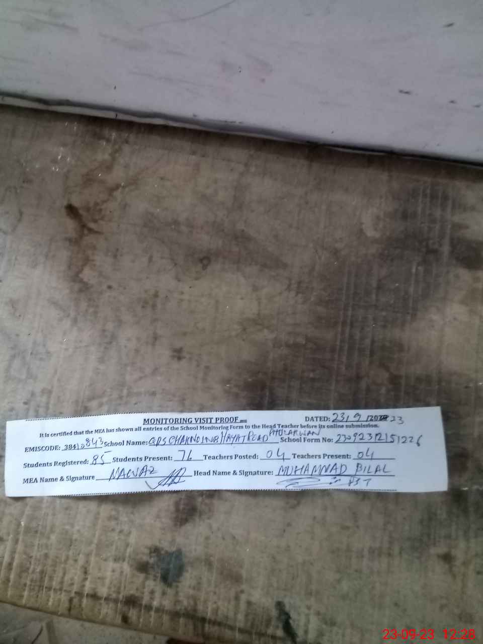| Attendance Register | Head Teacher | MEA with School | Visit Proof |