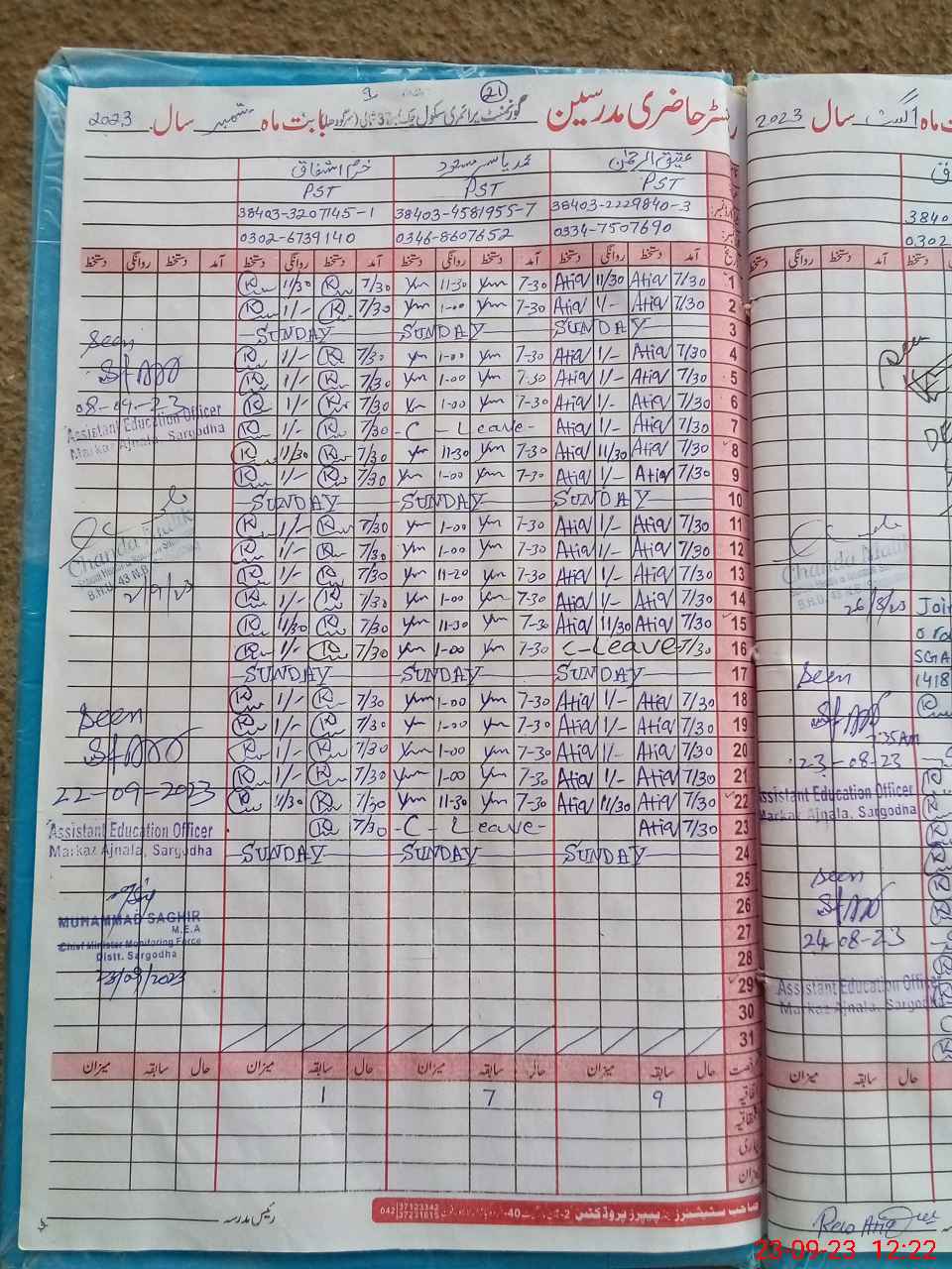 | Name: AT**** URRE**** Designation: (School Headmaster's/Headmistress's) PST Phone/Cell Number: 03**** 75**** |
