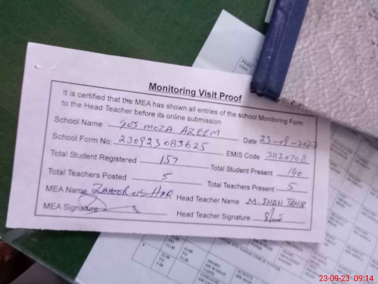 | Attendance Register | Head Teacher | MEA with School | Visit Proof |